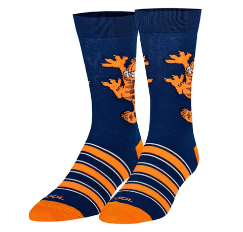 Step into playful comfort with these fun Garfield-themed socks. Featuring a bold navy background with bright orange accents on the heel and toe, these socks showcase a lively Garfield design along the calf and stylish striped patterns around the foot. Perfect for fans of the iconic comic cat, they offer a cheerful pop of color and personality for everyday wear.