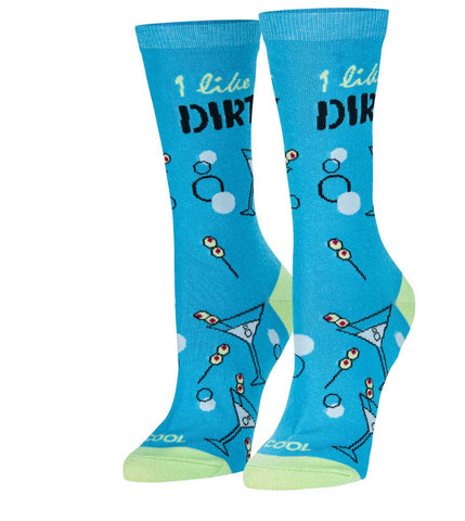 Step into fun and flair with these vibrant blue socks featuring playful martini glasses and olives. Carrying the cheeky phrase "I like it dirty," they add a splash of humor and personality to your outfit, perfect for cocktail parties or brightening up your everyday look. With contrasting lime-green heels and toes, these socks blend comfort and style in every step.