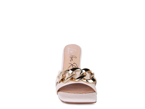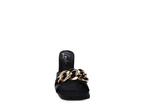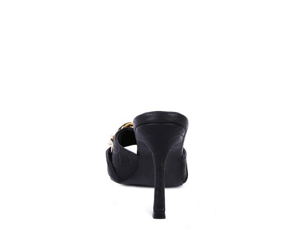 Mid Heel Sliders with quilted detail and big metallic chain decoration on straps is a trendy design and looks gorgeous on feet. Comes with insole cushioning which absorbs strain.