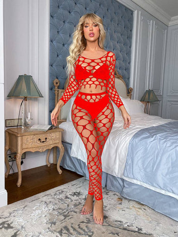 Sweetkama - Long Sleeves Lingerie Set Fishnet Bodystockings w563: Black / One Size