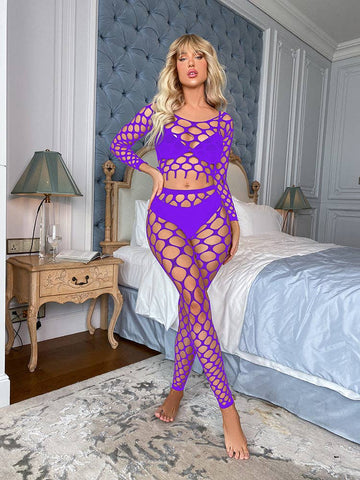 Sweetkama - Long Sleeves Lingerie Set Fishnet Bodystockings w563: Rose / One Size