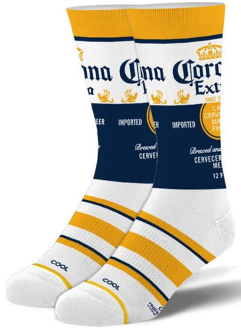 A pair of socks designed to resemble the branding of Corona Extra beer. The socks feature the signature colors and logo elements of the Corona beer label, including yellow, white, and navy blue stripes with printed text and graphics mimicking the original packaging.