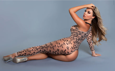 • Description: Oh, darling! This eye-catching animal print creation is perfect for adding a little excitement to your evening! It features a one-shoulder design with long sleeves and a neck tie, along with a one-legged bodystocking (thong not included).